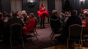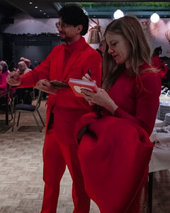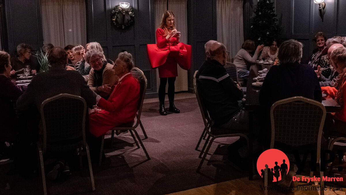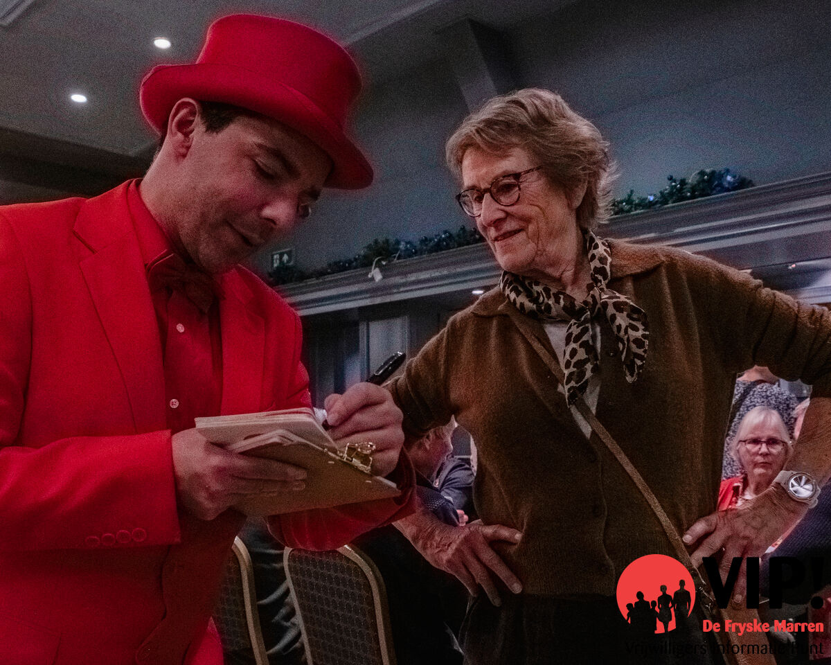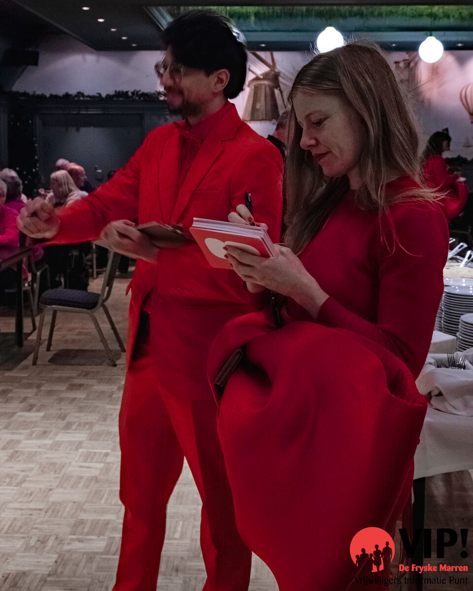 De Complimentenmakers, gekleed in opvallende rode pakken, wandelden door de zaal en deelden persoonlijke complimenten uit, wat al snel voor veel hartverwarmende glimlachen zorgde. Het was een mooie manier om de vrijwilligers in het zonnetje te zetten. Hun oprechte woorden brachten een extra glimlach op de gezichten van de vrijwilligers en maakten de avond nog specialer.