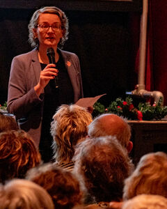 Na het stamppotbuffet sprak wethouder Sippy van der Meer over de waarde van vrijwilligers en hun vrijwilligerswerk binnen gemeente De Fryske Marren. De avond werd extra bijzonder door het bezoek van Laurentien van Oranje-Nassau, die ook haar waardering uitsprak voor de vrijwilligers. "Jullie inzet is van onschatbare waarde voor onze samenleving", zei ze, waarna ze een persoonlijke ode bracht aan de vrijwilligers. Ze deelde openhartig over haar eigen betrokkenheid bij kwetsbare groepen, zoals gezinnen getroffen door de toeslagenaffaire en benadrukte het belang van het daadwerkelijk in actie komen. Haar woorden raakten velen in de zaal en tijdens de vragenronde deelden vrijwilligers hun waardering voor Laurentien. Ze spraken met respect over haar inzet voor de getroffen gezinnen en kwetsbare burgers en hoe belangrijk ze het vonden dat zij altijd haar rug recht heeft gehouden. De emotie was wederzijds toen iedereen stil stond bij de kracht van vrijwilligers en de impact van vrijwilligerswerk in de samenleving.